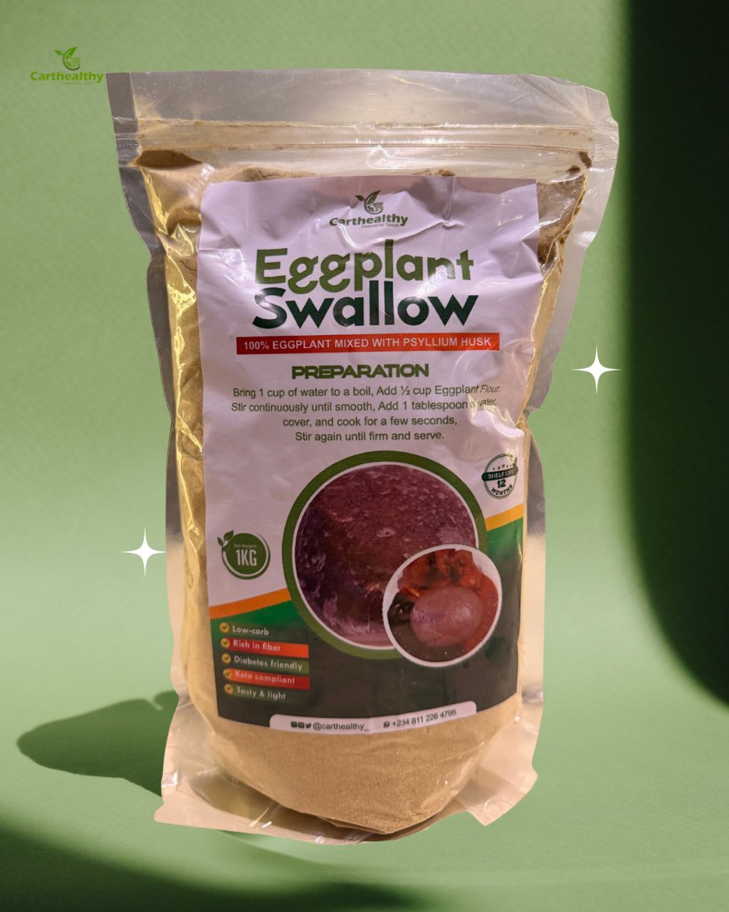 Revolutionize your meals with CART HEALTHY’s Eggplant Swallow—a low-carb, nutrient-dense alternative to traditional swallow. Made from 100% eggplant blended with psyllium husk, this innovative flour delivers authentic texture and taste while supporting your health goals.